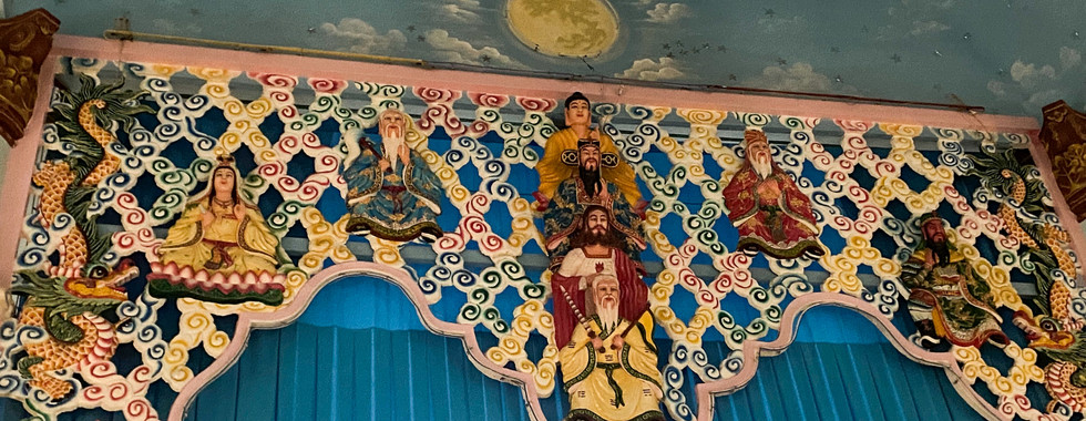 Stepping into a Cao Dai Thánh Thất (meaning ‘Sacred House’) felt like going into multiple dimensions at once— figures from multiple faiths coexist under one space. The Thánh Thất's appearance resists easy labels, and I found it almost impossible to describe using any familiar English architectural terms. The elongated layout and twin square towers recall a Catholic cathedral, while the decorative elements— dragons, lotus flowers, multi-tiered curved roofs, and colourful huachuang (Chinese-style open lattice-work windows)— are clearly drawn from pagodas and temples of East Asian beliefs. Vivid red, yellow, and blue dominate the space, symbolising the Tam Giáo, the Three Teachings of Confucianism, Buddhism, and Taoism, that form the philosophical foundation of Vietnamese and Cao Dai belief. The structure is neither a cathedral nor a pagoda, perhaps too diverse to be described simply as a temple, though that is the term most commonly used to refer to a Thánh Thất.